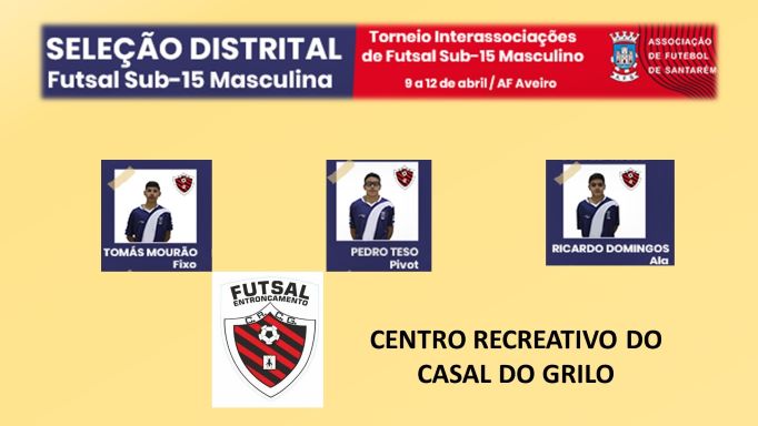 Tomás Mourão, Pedro Teso e Ricardo Domingos, atletas de Futsal em sub-15 do Centro Recreativo do Casal do Grilo vão participar no Torneio Interassociações promovido pela Federação Portuguesa de Futebol.
