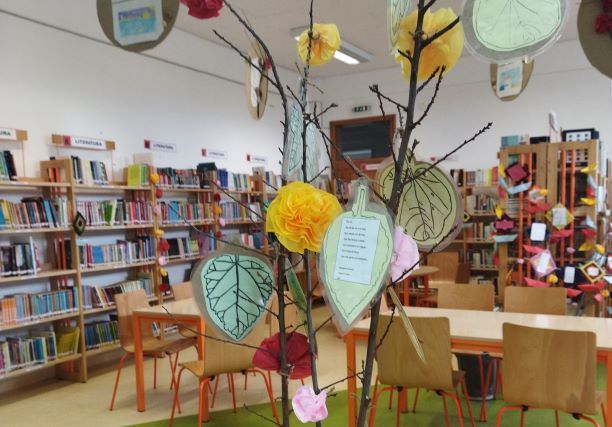 Com o mesmo propósito comemorativo, acrescentando o do Dia Mundial da Água, os alunos do 2º ciclo, na semana de 21 a 25 de março, expuseram, na Biblioteca Carlos Cécio, o resultado do trabalho desenvolvido desde novembro. O mote, para o 5º ano, foi Sophia de Mello Breyner com a leitura da sua obra A Menina do Mar e Chamo-me… Sophia, de José Jorge Letria. O 6.º ano partiu da leitura da obra Chamo-me… Almeida Garrett. Os trabalhos interdisciplinares, entretanto elaborados pelos alunos nas disciplinas de Português, TIC, EV/ET, EM e CN, alimentaram essa exposição e permitiram a elaboração de um E-book reunindo os poemas ilustrados e declamados pelos alunos. A Natureza, ou pedaços dela, e a imaginação conviveram com as palavras dos autores consagrados, mas também dos pequenos poetas. São estes que afirmam, em perfeita rima interna, ser A violeta da cor da caneta e que nos falam da existência das flores, como a rosa, que Passa a vida à chuva e ao sol/ E é mais bonita que o girassol, e a papoila, que Passa a vida a bailar,/ Todo o dia vermelha e bela. De todo o trabalho produzido, destaque-se as Árvores de Poesia, cujas folhas serão partilhadas com a comunidade no pelourinho da Vila de Constância, durante as Festas da Nossa Senhora da Boa Viagem.