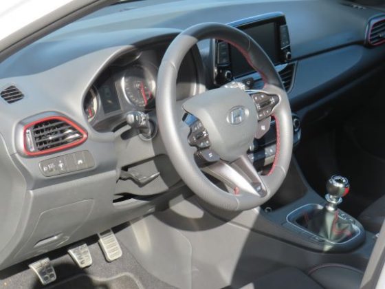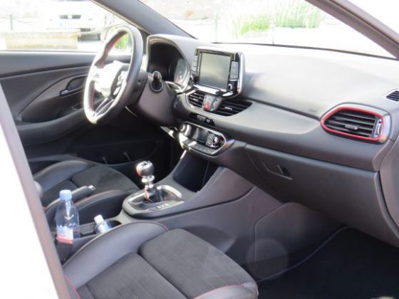 No geral os materiais são os mesmos usados na versão normal, temos material suave a cobrir o topo do tablier e portas, mas ao passarmos mais para baixo e na consola central já temos o uso dos plásticos, no entanto tudo com uma qualidade de construção exímia. Surpreendentemente, os materiais suaves presentes no topo das portas dianteiras, passa para as portas traseiras, o que não acontece em muitos automóveis, como o VW Golf por exemplo. Temos um friso vermelho em volta das saídas de ventilação para lhe conferir um ar mais desportivo. No entanto, não encontramos nenhuma razão para a Hyundai não os colocar também nas saídas centrais, o que iria tronar o tablier mais uniforme e contrastante. A maneta das mudanças também é diferente, tem uma pega e aspeto mais desportivos, com o topo redondo e metálico e, com uma pele perfurada com pormenores vermelhos. O volante também é diferente, com uma pega mais desportiva, pele perfurada com pormenores de pesponto a vermelho, e tem o logótipo N inserido na sua base. Um pormenor que gostamos bastante, que não existe noutros carros desportivos ou existe apenas como extra, é os botões dos modos de condução presentes no volante. Os botões colocados no volante favorecem a experiência de condução, pois não teremos que desviar a atenção da condução para a consola central para trocar o modo de condução, basta intuitivamente movermos o nosso polegar. O painel digital também é diferente. O conta rotações e velocímetro têm um fundo em carbono e no conta rotações está inserido o logótipo N. O ecrã presente no meio dos dois é a cores em vez de preto e branco, e por cima deste está as luzes do “Rev Matching”.