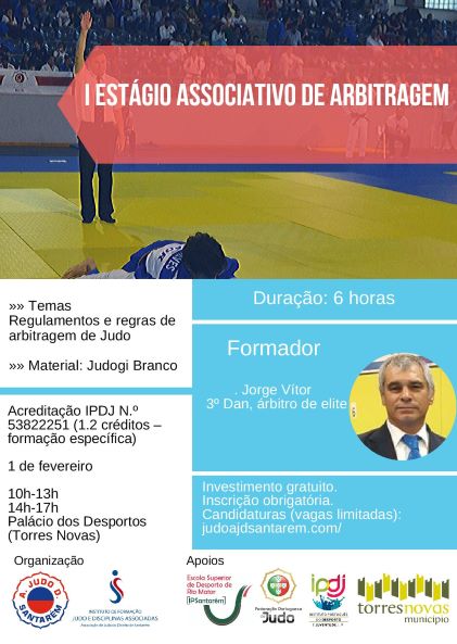 A Associação de Judo do Distrito de Santarém organiza, através do seu Instituto de Formação de Judo e Disciplinas Associadas, o I Estágio Associativo de Arbitragem, com a duração total de 6 horas, no dia 1 de fevereiro, das 10h às 13h e das 14h às 17h, no Palácio dos Desportos (Torres Novas).