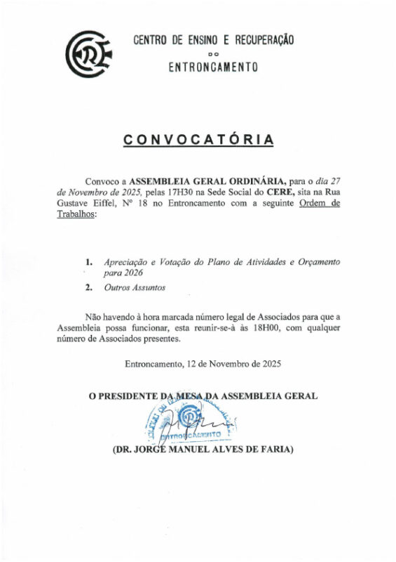 Início Publicidade Institucional Info Institucional: Convocatória para Assembleia Geral Ordinária do CERE Publicidade Institucional Info Institucional: Convocatória para Assembleia Geral Ordinária do CERE 20 Novembro, 2025 48 0 PUB PUB ARTIGOS RELACIONADOSMais do autor Info Institucional: COFERPOR convoca Assembleia Geral Ordinária para 16 de dezembro Edital da Assembleia de Freguesia de N.ª Sra. de Fátima Edital da Câmara Municipal do Entroncamento
