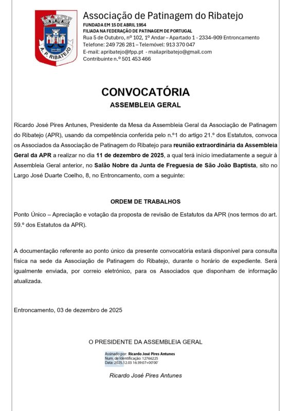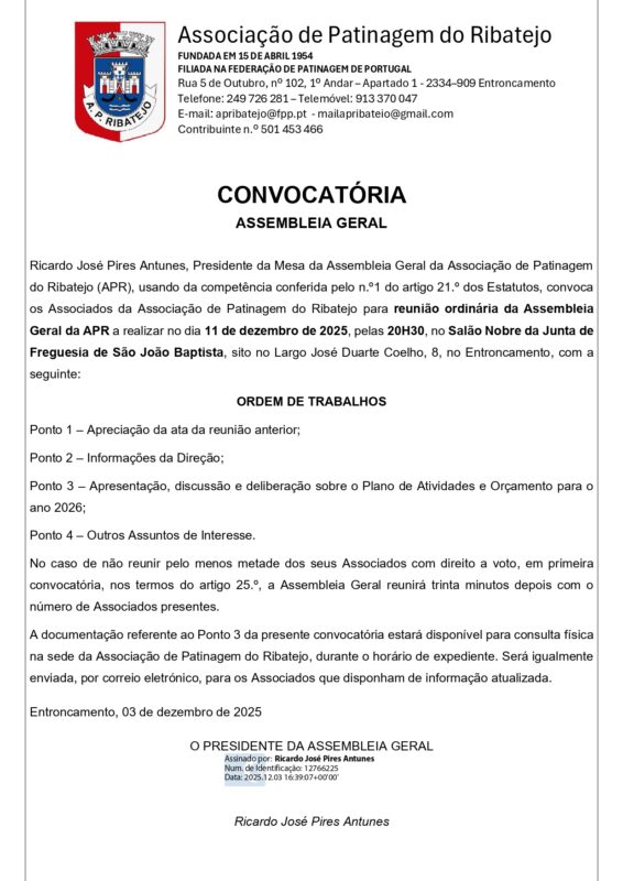 Início Publicidade Institucional Informação Institucional: Convocatória de Assembleia Geral da Associação de Patinagem do Ribatejo Publicidade Institucional Informação Institucional: Convocatória de Assembleia Geral da Associação de Patinagem do Ribatejo 7 Dezembro, 2025 73 0 PUB PUB PUB ARTIGOS RELACIONADOSMais do autor Info Institucional: Convocatória para Assembleia Geral Ordinária do CERE Info Institucional: COFERPOR convoca Assembleia Geral Ordinária para 16 de dezembro Edital da Assembleia de Freguesia de N.ª Sra. de Fátima PUB Ultimos Artigos Torres Novas: Manel Cruz, Carolina de Deus, Adolfo Luxúria Canibal, Tó Trips e Chico César... 7 Dezembro, 2025 NERSANT anuncia novas edições da Formação de Formadores em Torres Novas e Santarém 7 Dezembro, 2025 Torres Novas: Lançamento do n.º 37 da revista Nova Augusta, no Museu Municipal 7 Dezembro, 2025 Feira de Antiguidades e Velharias do Entroncamento 7 Dezembro, 2025 Convenção autárquica do Chega no Entroncamento marcada por críticas à política laboral do Governo 7 Dezembro, 2025 PUB Siga o EOL9,491FãsCurtir54SeguidoresSeguir427InscritosInscrever