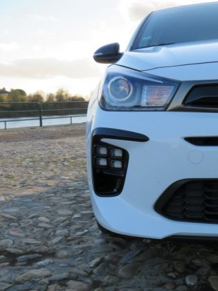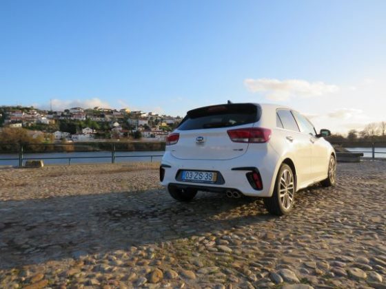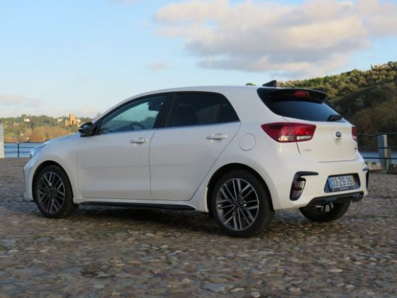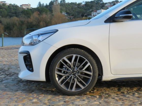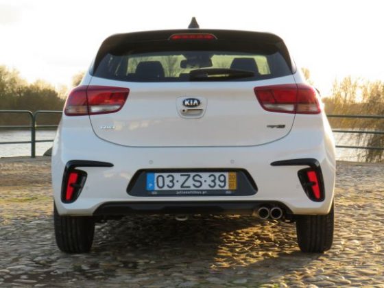Na parte dianteira temos uns para-choques mais acentuados e desportivos. Nas suas laterais temos uns plásticos pretos que ao longe parecem umas grandes entradas de ar, e as típicas luzes “ice cube” dos GT-Line da Kia. Na parte lateral destacam-se as jantes de 17 polegadas e pneu de baixo perfil que dão uma certa “stance” ao Rio. Na parte traseira temos no topo da bagageira a preto para contrastar com a carroçaria, um pequeno spoiler. No para-choques temos um pequeno difusor e duas ponteiras de escape desportivas, e também, tal como na parte dianteira, temos uns plásticos pretos que ao longe parecem umas entradas de ar.