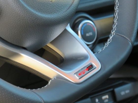 No interior temos um friso no tablier que imita fibra de carbono e que dá um ar desportivo à cabine. A qualidade dos materiais é o normal para este segmento, em que no topo do tablier temos material um pouco suave. Tudo o resto são plásticos. Os bancos são umas baquets desportivas com um encosto bom. Apesar de serem desportivas não são desconfortáveis. O volante também é desportivo em forma de D, e na sua base tem o logotipo “GT-Line”. A pega também é ótima e desportiva.