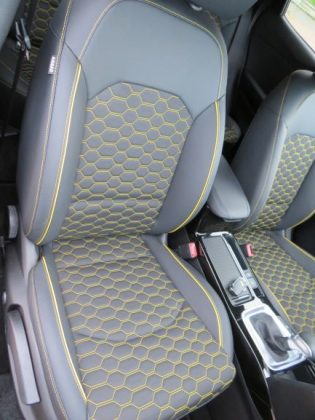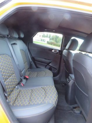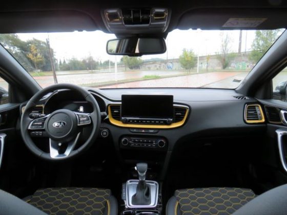 Por exemplo, neste caso temos em volta das saídas de ventilação, nos bancos e nas coberturas das portas o amarelo para combinar com a cor exterior! Tal como o design, a qualidade dos materiais é a mesma do Ceed, com material suave a cobrir grande parte do tablier, e ainda um efeito de pesponto no topo do mesmo. Os plásticos apenas aparecem mais abaixo e na consola central, sendo que na consola central está presente o plástico piano black, que tem um ótimo tratamento e não deixa grandes dedadas. O volante tem uma ótima pega e pele e, os comandos estão bem organizados, ao contrário de gerações anteriores da Kia.