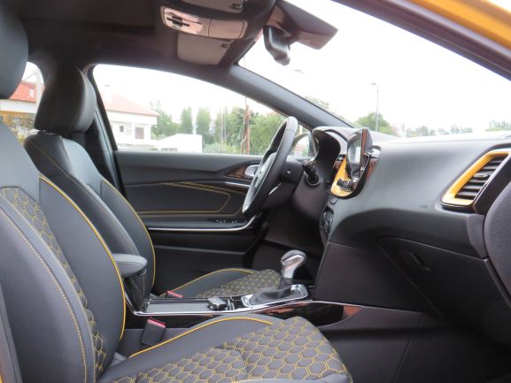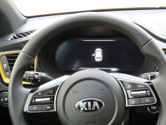 Por exemplo, neste caso temos em volta das saídas de ventilação, nos bancos e nas coberturas das portas o amarelo para combinar com a cor exterior! Tal como o design, a qualidade dos materiais é a mesma do Ceed, com material suave a cobrir grande parte do tablier, e ainda um efeito de pesponto no topo do mesmo. Os plásticos apenas aparecem mais abaixo e na consola central, sendo que na consola central está presente o plástico piano black, que tem um ótimo tratamento e não deixa grandes dedadas. O volante tem uma ótima pega e pele e, os comandos estão bem organizados, ao contrário de gerações anteriores da Kia.