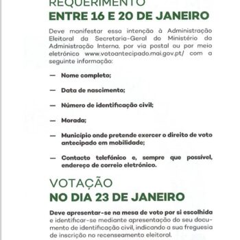 Quem está recenseado em território nacional e vai estar em mobilidade no dia das eleições, pode pedir o voto antecipado entre 16 e 20 de janeiro. O pedido é feito através da plataforma Voto Antecipado.
