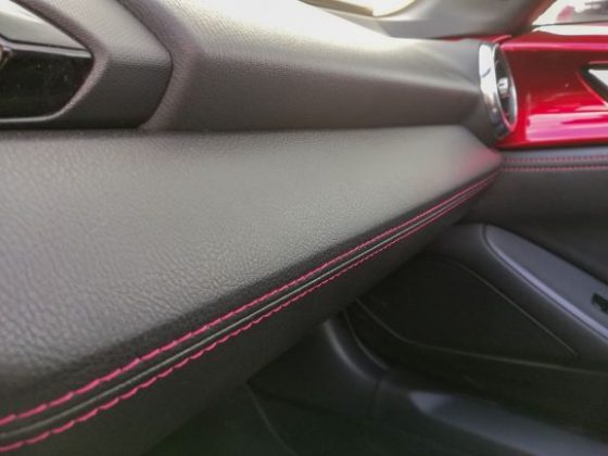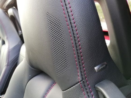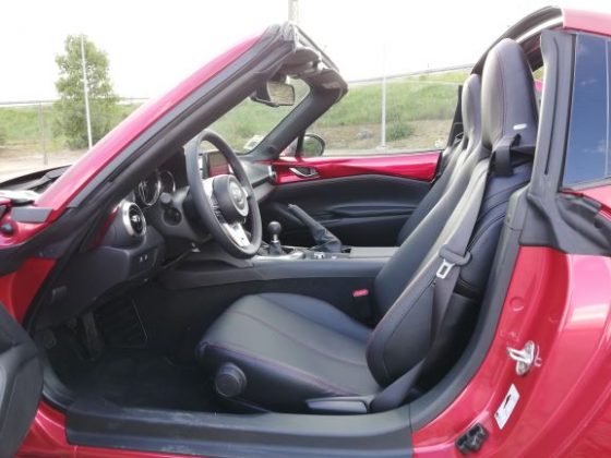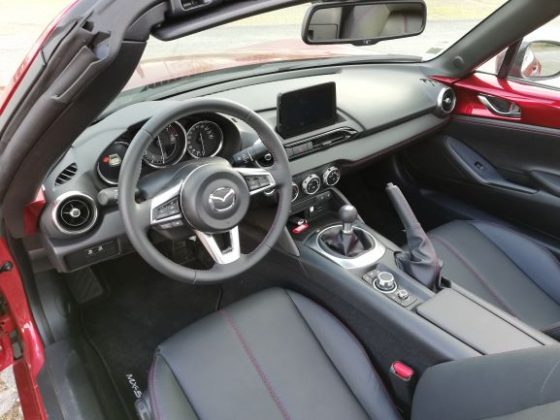 O design interior é igualmente desportivo. Temos umas baquets desportivas que têm umas colunas Bose no encosto de cabeça para podermos continuar a ouvir o rádio sem dificuldade mesmo com a capota em baixo. A consola central é grande e está numa posição elevada, o que nos coloca a manete das mudanças numa posição mais “à mão” do que nos carros “comuns”. A qualidade de construção é excelente, os materiais não são os melhores, mas também não são os piores. Temos material parcialmente suave a cobrir o tablier com um efeito pesponto a vermelho, que se prolonga pelas coberturas do centro das portas. Infelizmente no topo das portas não temos qualquer cobertura é chapa, mas o MX-5 é um carro de diversão e não de conforto e a falta de “materiais de luxo” é com o intuito na redução de peso.
