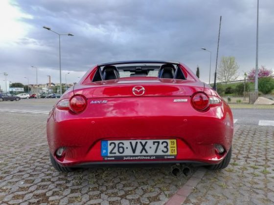 O design exterior do MX-5 é mais desportivo do que os modelos anteriores, os quais se apresentavam mais “redondinhos e fofinhos” muitas vezes associados a carros de mulher. Neste novo modelo temos a nova linguagem de design que a Mazda intitula de “Kodo: alma do movimento”. Na parte dianteira temos as embaladeiras arredondadas, mas alguns ângulos mais retos como as pontas das óticas que são pequenas e finas. Temos uma grande grelha e uns spoilers inferiores no para-choques por baixo dos faróis de circulação diurna. Na parte lateral temos umas jantes de 16 polegadas pintadas a cinzento. Conseguimos também vislumbrar o perfil do MX-5 que tem o seu ponto de gravidade bastante baixo, e conseguimos apreciar o seu design de Targa, caso a capota esteja em baixo, ou de coupé, caso a capota esteja em cima. Na parte traseira, à semelhança da parte dianteira, as óticas também são pequenas e finas, e as embaladeiras arredondadas. Contamos também com uma dupla ponteira de escape que faz um sonzinho muito emocionante que nos deixa com um sorriso na cara.