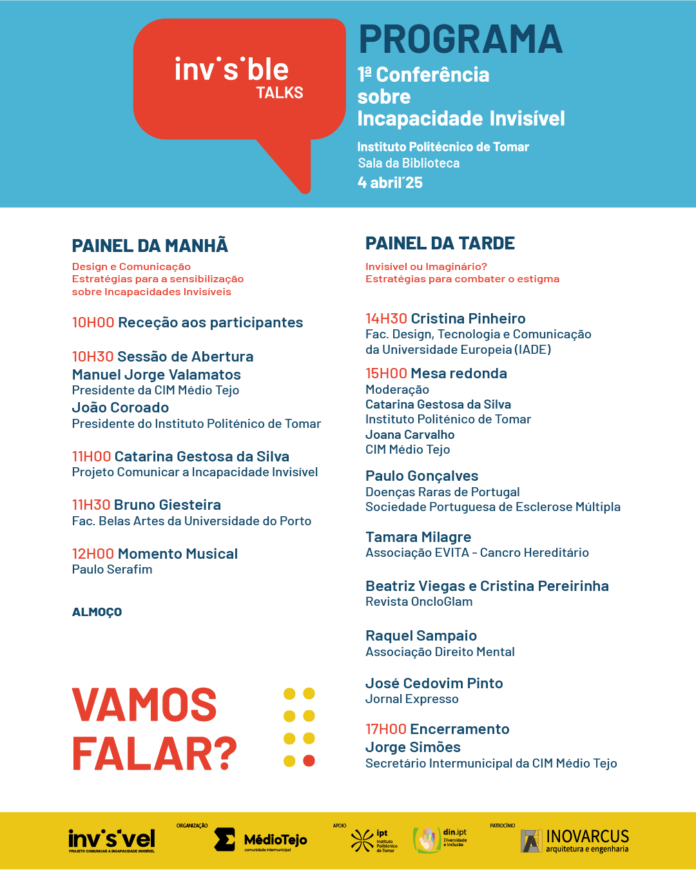Do programa destaque para dois painéis, o da manhã, com início às 10h00, dedicado ao Design e Comunicação – Estratégias para a Sensibilização sobre Incapacidades Invisíveis, que contará com uma sessão de abertura com a presença de Manuel Jorge Valamatos, presidente da CIM Médio Tejo e João Corado, presidente do IPT.
