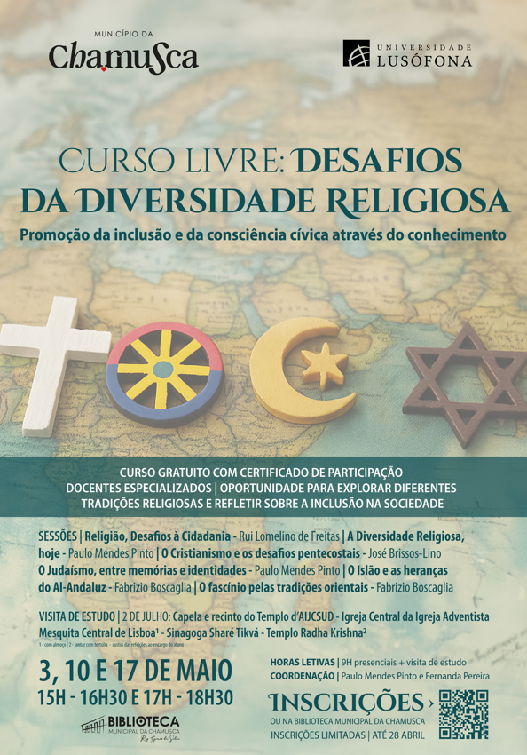 A Universidade Lusófona, em parceria com o Município da Chamusca, promove o curso livre “Desafios da Diversidade Religiosa”, coordenado pelos professores Paulo Mendes Pinto e Fernanda Pereira. A iniciativa visa proporcionar um espaço de reflexão sobre inclusão, diversidade e cidadania.