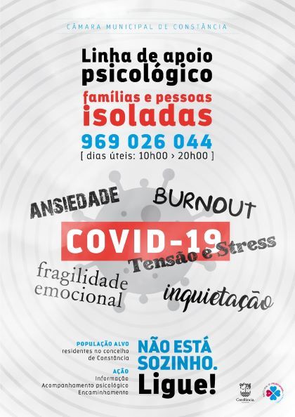 A Câmara Municipal de Constância, tendo consciência da ansiedade que o isolamento social pode causar, disponibiliza apoio psicológico às famílias e pessoas isoladas residentes no Município.