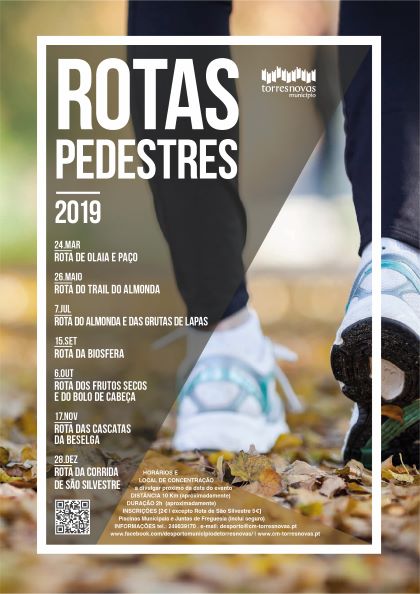 O Município de Torres Novas promove o projeto “Rotas Pedestres 2019” que contempla a realização ao longo do ano de sete Caminhadas, com o objetivo de dar a conhecer alguns dos locais de excelência existentes no concelho, possibilitando a prática de atividade física em contacto com a Natureza.