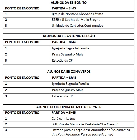 A iniciativa “Vou a Pé Para a Escola! “ irá funcionar com partida às 8h45 de pontos de encontro definidos para cada escola. Em cada ponto de encontro estará um Guia que irá “dar boleia” aos alunos até à escola, com o apoio da P.S.P. – Polícia de Segurança Pública.