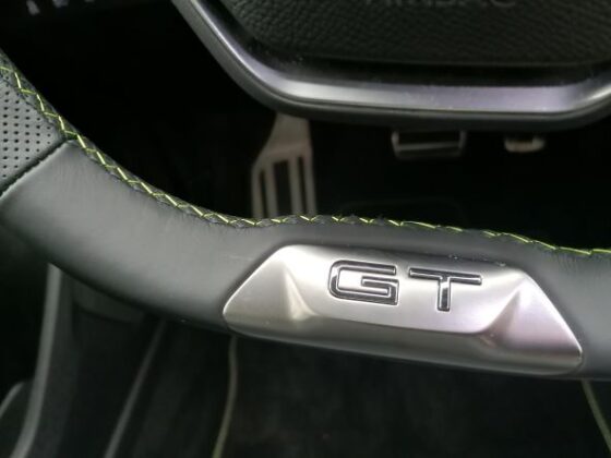 Temos um tablier com muitas curvas e ângulos, e temos muito uso de plástico piano black, que confere ao interior mais requinte. A qualidade geral é bastante boa. Temos material suave por todo o tablier e na consola central, e como se trata da versão GT temos um efeito de pesponto amarelo flurescente (cor da Peugeot Sport). Nas portas também temos bastante qualidade, sendo que só temos plásticos nas partes inferiores. Os bancos são umas baquets desportivas com um bom encosto mas confortáveis ao mesmo tempo. O volante é a única peça igual de um modelo para o outro. Continuamos com o volante pequeno e com aspecto mais retângular, a diferença é que tem o logo novo da Peugeot.