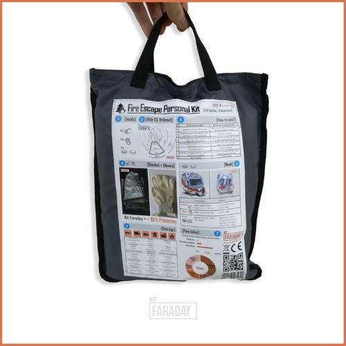 Assim, foi desenvolvido um kit de sobrevivência a incêndios que, além da Manta Faraday®, inclui um Respirador certificado, capaz de proteger as vias respiratórias e oculares de mais de 95% dos fumos tóxicos, e ainda um par de Luvas de Aramida, também com certificação, que protegem do toque de temperaturas até 200°C.