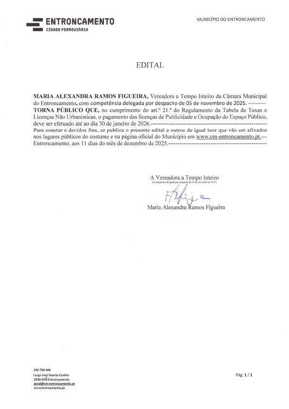Início Publicidade Institucional Pub Institucional: Edital do Pagamento das Licenças de Publicidade e Ocupação do... Publicidade Institucional Pub Institucional: Edital do Pagamento das Licenças de Publicidade e Ocupação do Espaço Público para 2026 – Município do Entroncamento 18 Dezembro, 2025 29 0 PUB PUB ARTIGOS RELACIONADOSMais do autor Informação Institucional: Convocatória de Assembleia Geral da Associação de Patinagem do Ribatejo Info Institucional: Convocatória para Assembleia Geral Ordinária do CERE Info Institucional: COFERPOR convoca Assembleia Geral Ordinária para 16 de dezembro PUB Ultimos Artigos Serviços municipais do Entroncamento encerrados em dias de tolerância de ponto 18 Dezembro, 2025 GNR inicia Operação “Natal e Ano Novo 2025/2026” e deixa conselhos 18 Dezembro, 2025 Pub: No Intermarché o Aniversário também é coisa séria! 18 Dezembro, 2025 Presidente da Junta de Nossa Senhora de Fátima elogia operações da PSP no Entroncamento 18 Dezembro, 2025 Politécnico de Tomar destaca-se em práticas de economia circular na gestão da água 18 Dezembro, 2025 PUB Siga o EOL9,491FãsCurtir54SeguidoresSeguir427InscritosInscrever