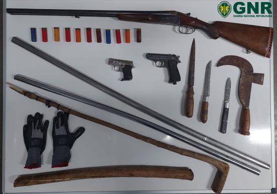 No seguimento da ação foi dado cumprimento ao mandado de detenção e realizadas duas buscas, uma domiciliária e uma em veículo, que culminaram na apreensão de uma arma de caça, duas pistolas, 11 munições, três facas, uma foice, duas barras de ferro,dois bastões de madeira e um par de luvas.