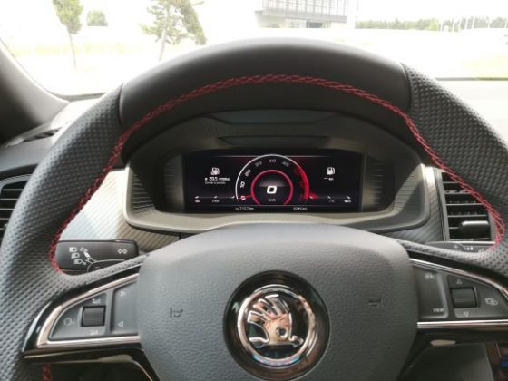 Na auto estrada o Kodiaq RS é muito silencioso, a cabine está bem isolada não temos muitos barulhos intrusivos, e em modo “Comfort” a suspensão é suave e as baquets são confortáveis e ergonómicas, contribuindo assim para uma viagem relaxada. Em percurso urbano, apesar do seu tamanho, também é muito fácil de conduzir. Temos uma boa visão de todos os ângulos devido à posição de condução elevada, a direção é bastante leve (mais do que no Octavia) e, o assistente de estacionamento é muito completo com várias visões para a câmara traseira, incluindo 360º. Se quisermos ter um pouco mais de divertimento basta colocarmos o Kodiaq RS em modo “Sport” e, imediatamente a suspensão fica mais rija e o motor e caixa mais responsivo. Nas curvas comporta-se de forma exemplar para um SUV destas dimensões, e a sua resposta do acelerador ao sair delas é bastante bom. Como se trata de um motor a diesel obviamente não temos aquela emoção do ruído de um motor a gasolina, pelo que a Skoda optou por colocar um som artificial proveniente das colunas para simular o barulho do motor e envolver o condutor nesse espírito de “Track Day”. No entanto para quem não está habituado, ou que não goste deste tipo de “falsidades”, o barulho pode tornar-se um pouco estranho e incomodativo.
