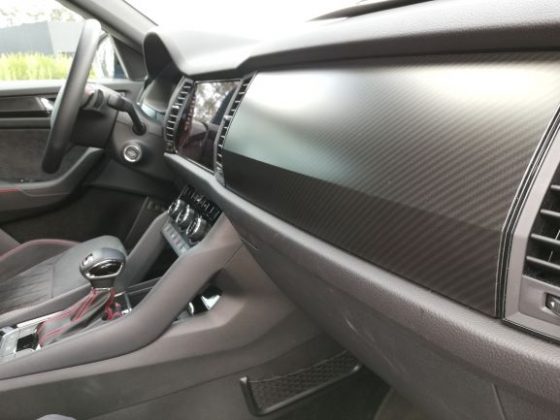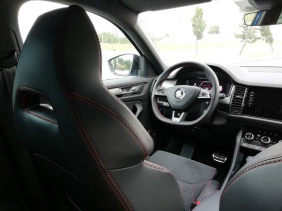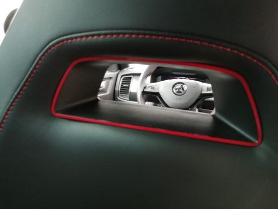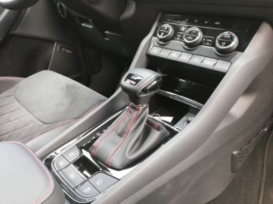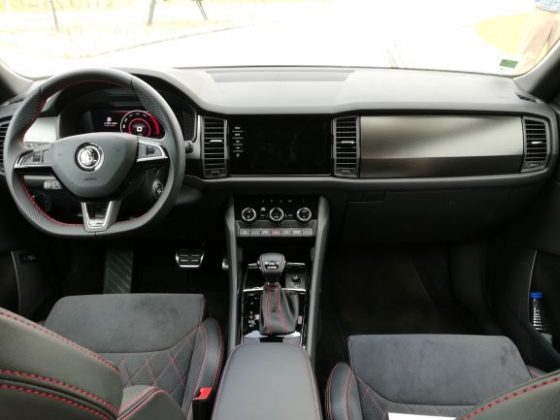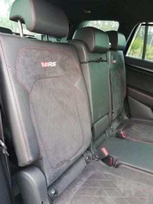 No topo do tablier temos material suave, e, no centro temos uma imitação de fibra de carbono, sendo que nas partes mais inferiores e na consola central temos os plásticos, no entanto a Skoda faz uso dos plásticos piano black para dar um ar mais requintado à cabine. Sendo que se trata da versão RS temos algumas diferenças em relação ao modelo normal. Para começar, temos pespontos vermelhos em todo o lado, nos bancos, volante, seletor da caixa de velocidades, etc. O volante tem uma pega e um formato desportivo, formato em D. As baquets são excelentes, com um aspeto muito desportivo, um encaixe bom, mas ao mesmo tempo muito confortáveis. As baquets para além dos pespontos vermelhos têm também um efeito de fibra de carbono nas suas extremidades, alcântara no meio e o logo “RS”. À semelhança do que acontece nos baquets, nos bancos traseiros também temos o efeito de fibra de carbono, a alcântara e o logo “RS” no meio, incluindo os da terceira fila!