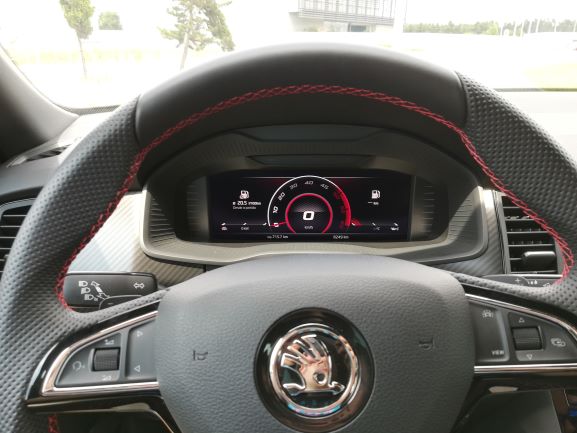 Na auto estrada o Kodiaq RS é muito silencioso, a cabine está bem isolada não temos muitos barulhos intrusivos, e em modo “Comfort” a suspensão é suave e as baquets são confortáveis e ergonómicas, contribuindo assim para uma viagem relaxada. Em percurso urbano, apesar do seu tamanho, também é muito fácil de conduzir. Temos uma boa visão de todos os ângulos devido à posição de condução elevada, a direção é bastante leve (mais do que no Octavia) e, o assistente de estacionamento é muito completo com várias visões para a câmara traseira, incluindo 360º. Se quisermos ter um pouco mais de divertimento basta colocarmos o Kodiaq RS em modo “Sport” e, imediatamente a suspensão fica mais rija e o motor e caixa mais responsivo. Nas curvas comporta-se de forma exemplar para um SUV destas dimensões, e a sua resposta do acelerador ao sair delas é bastante bom. Como se trata de um motor a diesel obviamente não temos aquela emoção do ruído de um motor a gasolina, pelo que a Skoda optou por colocar um som artificial proveniente das colunas para simular o barulho do motor e envolver o condutor nesse espírito de “Track Day”. No entanto para quem não está habituado, ou que não goste deste tipo de “falsidades”, o barulho pode tornar-se um pouco estranho e incomodativo.