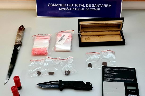 No decurso da referida busca foi apreendido ao detido duas armas brancas, 12 doses de produto suspeito de ser Haxixe, uma balança de precisão, 2 cartuchos calibre 12 GA e diverso material para acondicionamento de produto estupefaciente.
