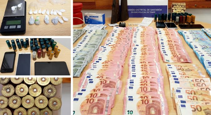 A Esquadra de Investigação Criminal da Divisão Policial de Tomar, com o apoio operacional de outras Subunidades e da Unidade Especial de Polícia, no âmbito de um Inquérito de Tráfico de Produto Estupefaciente, deu cumprimento a Mandados Judiciais de busca e apreensão a uma residência e duas viaturas, tendo procedido à detenção de um indivíduo de sexo feminino, com 49 anos de idade, e um indivíduo de sexo masculino, com 50 anos de idade, tendo aprendido sete mil novecentos e oitenta euros)em notas, 11 doses de produto estupefaciente, suspeito de ser Heroína, 9 doses de produto estupefaciente, suspeito de ser Cocaína , 2 armas de fogo, 32 cartuchos calibre 16, 26 cartuchos calibre 12, 3 telemóveis, 1 balança de precisão, diverso material relacionado com o tráfico de estupefaciente 1 moinho, produto de “corte”, diversos plásticos de acondicionamento de produto estupefaciente.