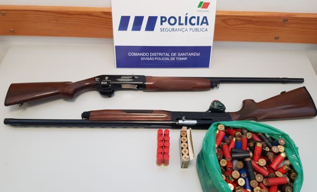 Na sequência da detenção foi dado cumprimento a Mandado de Busca Domiciliária tendo sido apreendido duas espingardas Caçadeira calibre 12 e duzentos e nove cartuchos calibre 12.