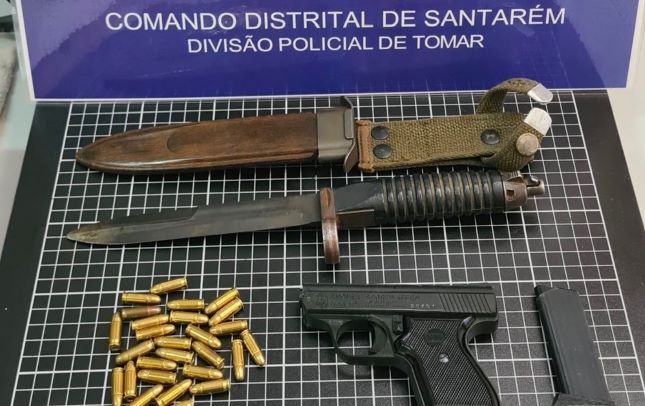 Ao detido foi apreendido uma pistola calibre 6.35mm, vinte e sete munições 6.35 e um sabre-baioneta.