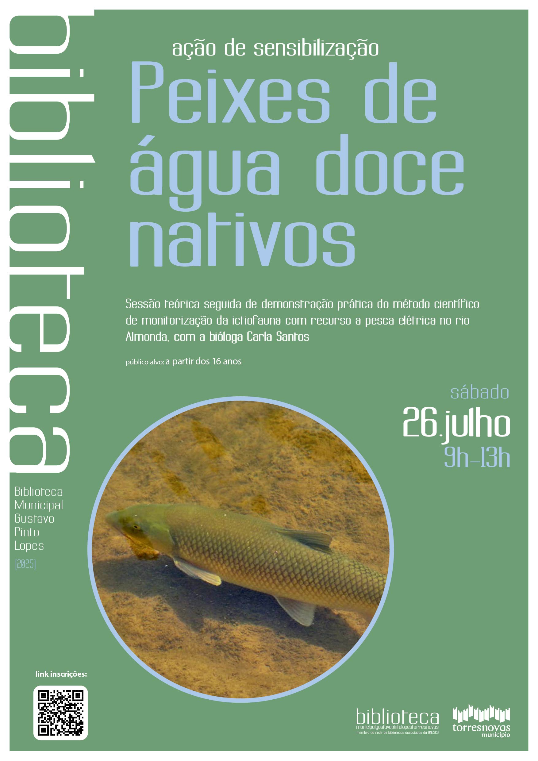 Com o objetivo de sensibilizar para conservação dos peixes nativos e na identificação de possíveis ameaças, como espécies invasoras ou impactos ambientais, o Município de Torres Novas vai promover, no dia 26 de julho, na Biblioteca Municipal Gustavo Pinto Lopes (BMGPL), uma ação de sensibilização intitulada «Peixes de Água Doce Nativos» com a bióloga Carla Santos.