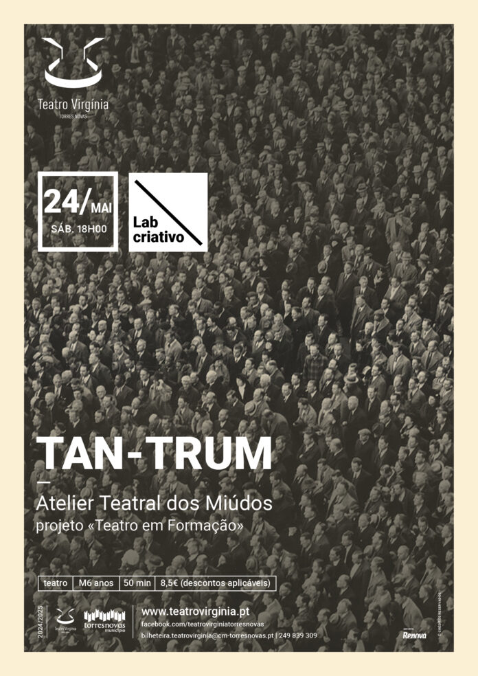 O Atelier Teatral dos Miúdos, do projeto «Teatro em Formação» do Teatro Virgínia, estreia no próximo sábado, dia 24 de maio, pelas 18 horas, a pela Tan-Trum. Os bilhetes têm o custo de 8,5 euros, sendo aplicáveis descontos.