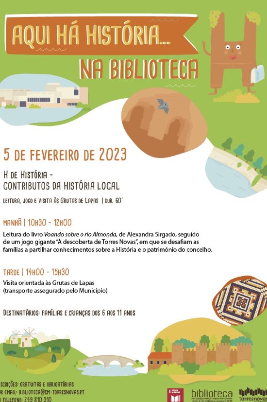 No âmbito do ciclo de atividades Aqui Há História… na Biblioteca, integrado no projeto Almonda = Al Mundo, um rio à nossa volta, a Biblioteca Municipal Gustavo Pinto Lopes, em Torres Novas, promove no próximo dia 5 de fevereiro a atividade H de História – contributos da história, que inclui leitura, jogo e visita às Grutas de Lapas para famílias e crianças dos 6 aos 11 anos. As inscrições são gratuitas, mas obrigatórias e limitadas, podendo ser efetuadas através do email biblioteca@cm-torresnovas.pt ou telefone 249810310.
