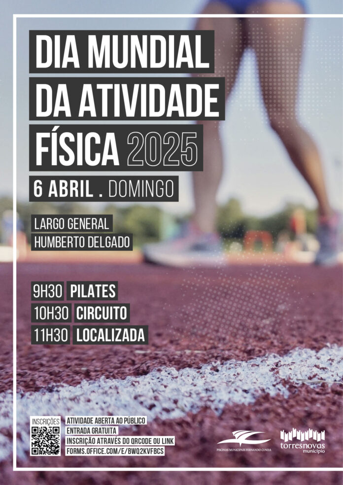 Com o objetivo de comemorar o Dia Mundial da Atividade Física, o Município de Torres Novas vai promover no próximo dia 6 de abril, um programa de aulas de fitness. Terão lugar aulas de pilates (9h30), circuito (10h30) e localizada (11h30).