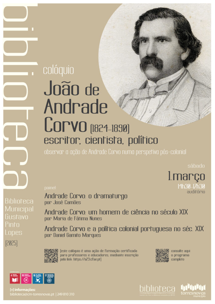 O Município de Torres Novas vai promover, na Biblioteca Municipal Gustavo Pinto Lopes, um colóquio para assinalar os 200 anos do nascimento de João Andrade Corvo (1824-1890), escritor, cientista e político torrejano. A iniciativa terá lugar no dia 1 de março, a partir das 14h30, constituindo-se como ação de formação certificada, direcionada a professores e educadores, com inscrição obrigatória através do site: https://a23.cfae.pt