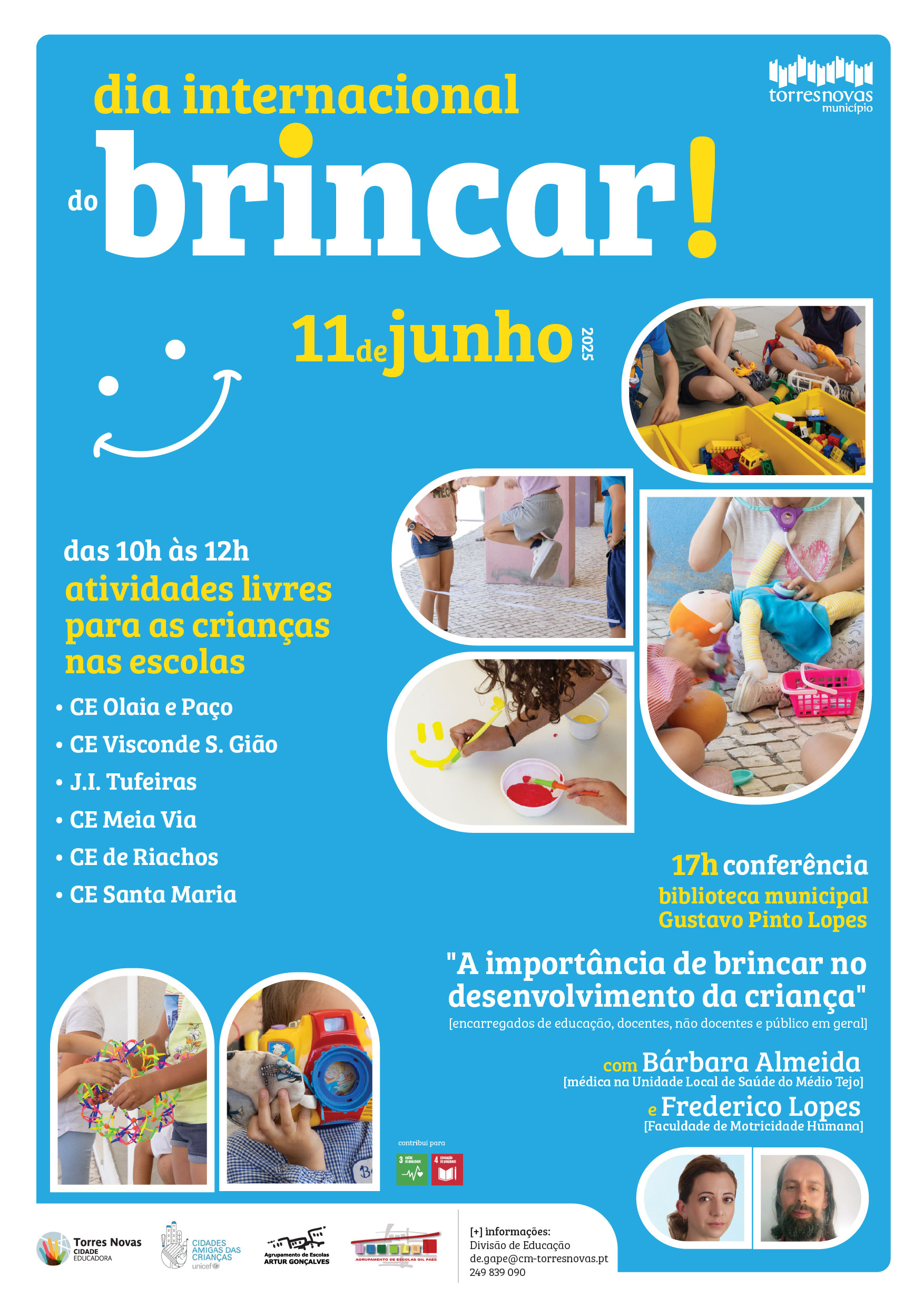 Entre as 10h e as 12 horas haverá atividades livres para as crianças nos centros escolares de Olaia e Paço, de Meia Via, de Riachos, de Visconde S. Gião e de Santa Maria, bem como no Jardim de infância de Tufeiras. À tarde está prevista, pelas 17 horas, na Biblioteca Municipal Gustavo Pinto Lopes, a conferência “A importância de brincar no desenvolvimento da criança”, com Bárbara Almeida, médica na Unidade Local de Saúde do Médio Tejo e Frederico Lopes, da Faculdade de Motricidade Humana. A iniciativa destina-se a encarregados de educação, docentes, não docentes e público em geral.