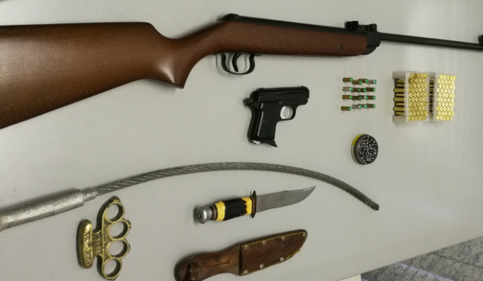 No cumprimento de um Mandado de Busca domiciliária, foi-lhe apreendido, uma soqueira em metal, uma bainha com 13,4cm de lâmina, uma arma de ar comprimido, duzentos e trinta chumbos de arma de ar comprimido, uma arma de fogo, espingarda tipo Flobert, cem cartuchos Flobert de 9mm, uma arma de alarme, dezasseis munições de alarme e um cabo de aço com cerca de 57 cm de comprimento e 1cm de diâmetro.