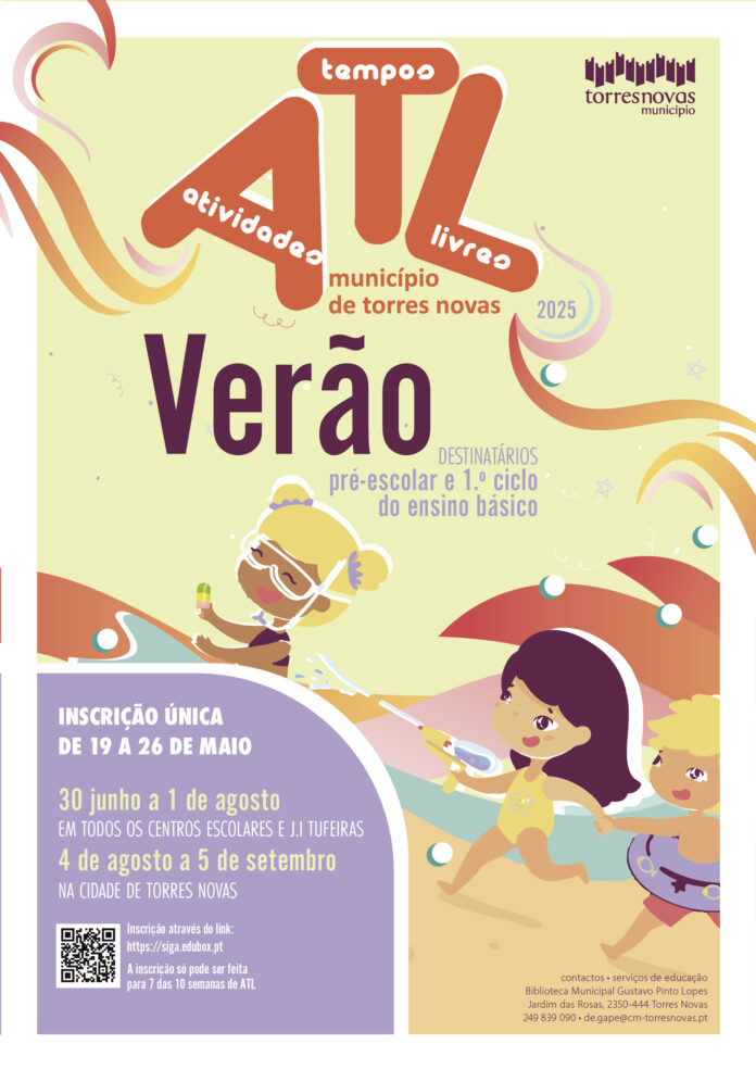 O Município de Torres Novas, à semelhança de anos anteriores, volta a promover o projeto de Atividades de Tempos Livres (ATL) de verão, destinado a crianças do pré-escolar e alunos do 1º ciclo do ensino básico.