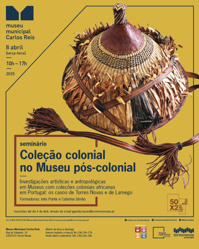 O Município de Torres Novas vai promover, no próximo dia 8 de abril, terça-feira, no Museu Municipal Carlos Reis, o seminário intitulado «Coleção colonial no museu pós-colonial – Investigações artísticas e antropológicas em Museus com coleções coloniais africanas em Portugal: os casos de Torres Novas e de Lamego». A iniciativa, mediada por Inês Ponte (antropóloga) e Catarina Simão (artista e investigadora), decorrerá entre as 10 e as 17 horas e é dirigido, sobretudo, a profissionais das áreas da museologia e do património cultural, que poderão inscrever-se, gratuitamente, através do e-mail agenda.museu@cm-torresnovas.pt.