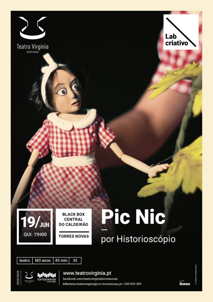 O Teatro Virgínia leva até à Black Box da Central do Caldeirão, no próximo dia 19 de junho, quinta-feira (feriado), o espetáculo «Pic Nic» do projeto Historioscópio – Teatro de Marionetas. A sessão destina-se a crianças a partir dos 3 anos, terá início às 11 horas e o bilhete tem o custo de 3 €.
